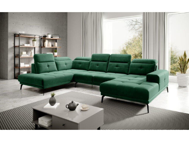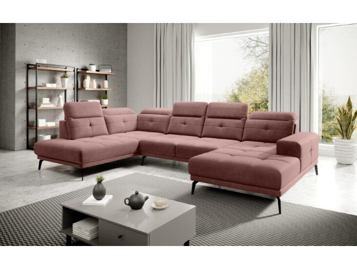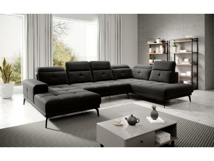 Sedežna garnitura RETAN je moderna ter elegantna. Garnitura je v celoti oblazinjena z visokokakovostnim blagom in prešita z modernim vzorcem. Polnjena je z visoko elastično peno ter vzmetena z valovitimi vzmetmi. Zahvaljujoč nastavljivim vzglavnikom ter premičnim naslonom za hrbet po globini nudi dodatno udobje. Kovinske črne noge zagotavljajo eleganten videz. Sedežna je na voljo v več barvah tkanine, ter ji je potrebno določiti levi ali desni kot postavitve.