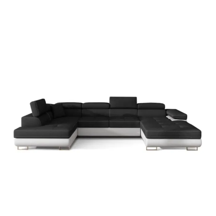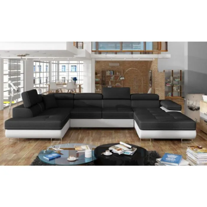 Sedežna garnitura RODRIGO – črno/bela je moderna in kvalitetna. Ima nastavljive vzglavnike ter vsebuje zaboj za shranjevanje. Sedežna se raztegne v ležišče z dolphine raztegljivim mehanizmom. Sedežna garnitura je vzmetena z valovitimi vzmetmi.