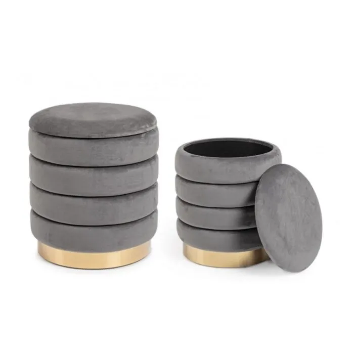 Set 2 taburejev DARINA siva ima strukturo iz MDF-ja in vezane plošče, prevleko ima iz poliestra ki oddaja učinek žameta. Dno je zlatne barve.