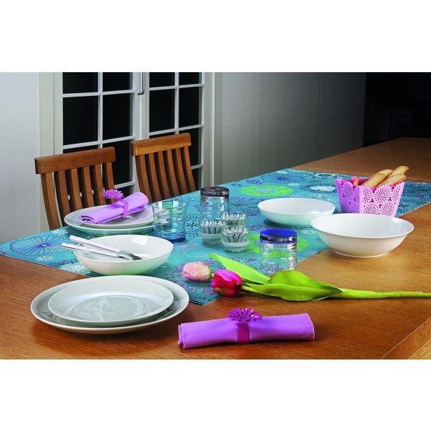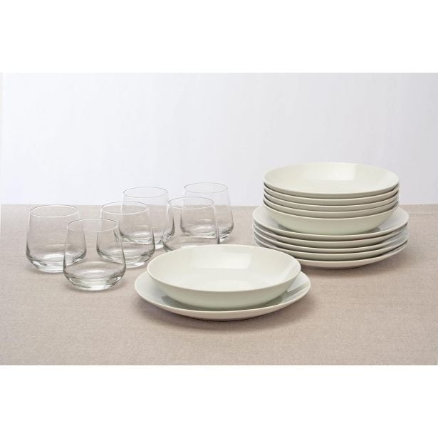 Jedilni set Metropolis linije je sestavljen iz 18 kosov, vključno s 6 jedilnimi krožniki, 6 jušnimi in 6 desertnimi krožniki, različnih oblik in velikosti. Gre za namizni servis znamke “Tognana” iz finega porcelana, bele barve.