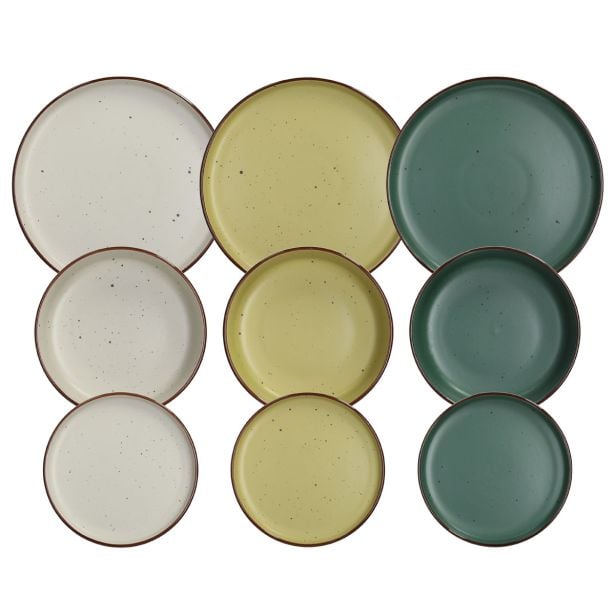 Komplet barvnih plošč je edinstven in izviren zaradi bele, rumene oker in zelene barve, ki jih je mogoče kombinirati v kompletih ton v ton ali mix&match za sveže in živahno vzdušje. Sestavljen je iz 6 krožnikov, 6 krožnikov za juho in 6 krožnikov za sladice, je varen za mikrovalovno pečico in pomivalni stroj.