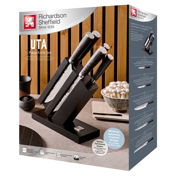 Uta v japonščini pomeni vkovano. Inovativen dizajn. 5-delni set blokov nožev vsebuje: nož za lupljenje, nož za kuhanje, kuharski nož, rezbarski nož in nož za kruh.