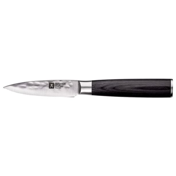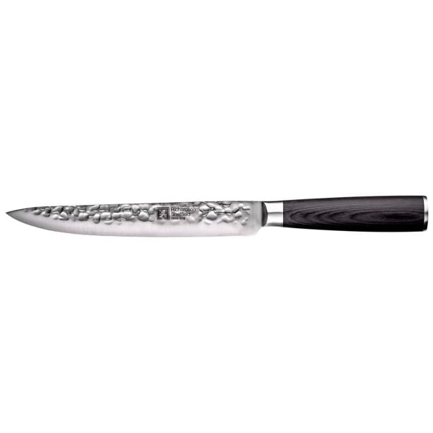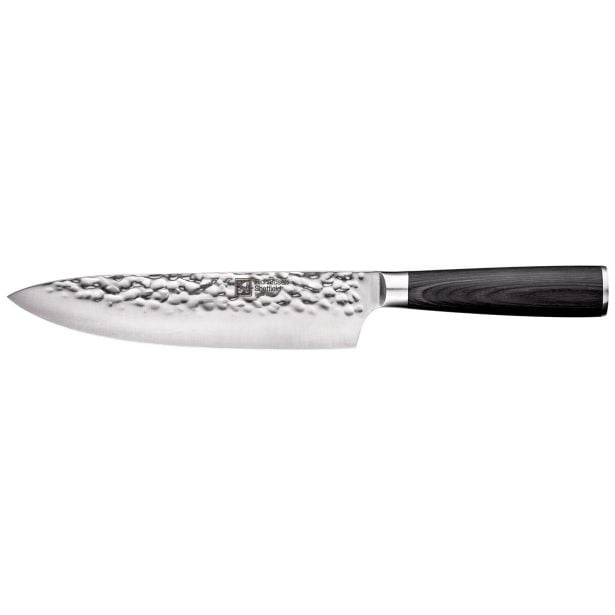 5-delni komplet blokov nožev vsebuje: nož za lupljenje, nož za kuhanje, kuharski nož, rezbarski nož in nož za kruh. Inovativna oblika, okraski s kladivom na rezilu, visokokakovostno nerjaveče jeklo, Ročaj iz temnega pakka lesa, moderen in stabilen blok.