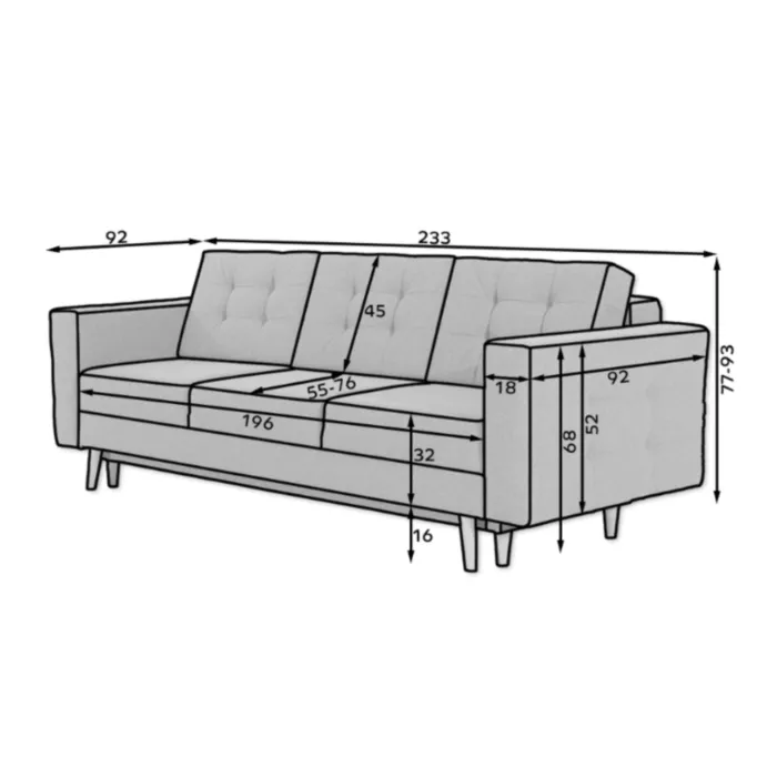 Ima inovativni sistem zlaganja DL. Sistem DL omogoča enostavno in lažje preoblikovanje troseda v ležišče. Poleg dodatnega ležišča ima tudi posodo za shranjevanje posteljnine. Trosed je vzmeten z valovitimi vzmetmi, kar zagotavlja še večjo udobnost.