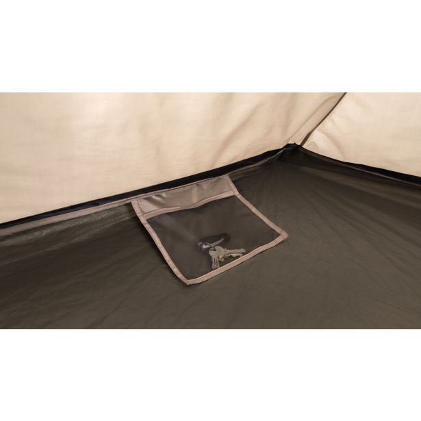 Za učinkovito kroženje zraka poskrbi pokrita strešna prezračevalna odprtina, ki skupaj z mrežnimi vrati zagotavlja dober pretok svežega zraka tudi v toplih dneh. Notranjost šotora vključuje tudi držalo za svetilko, ki omogoča dodatno praktičnost pri večernem bivanju.