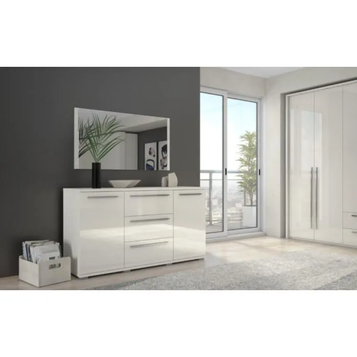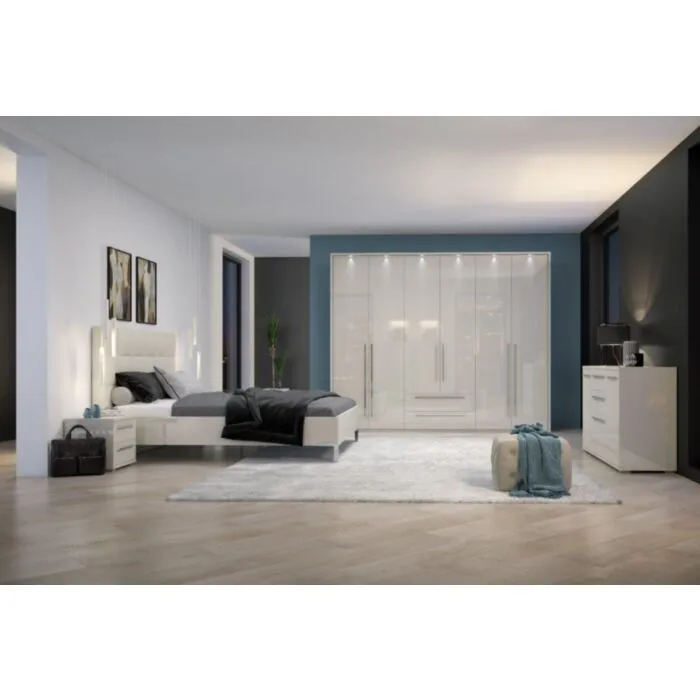 posteljo, dve nočni omarici, komodo in garderobno omaro. Omara ima mehko zapiranje. Ima tri krila, sedem polic, dva predalnika in tri palice za obešanje oblačil. Komplet ne vsebuje vzmetnice.