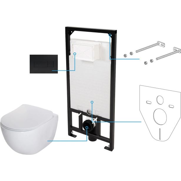Toaletni komplet z visečo školjko je zasnovan za visoko estetiko prostora in enostavno čiščenje. Bela straniščna školjka in temna tipka.