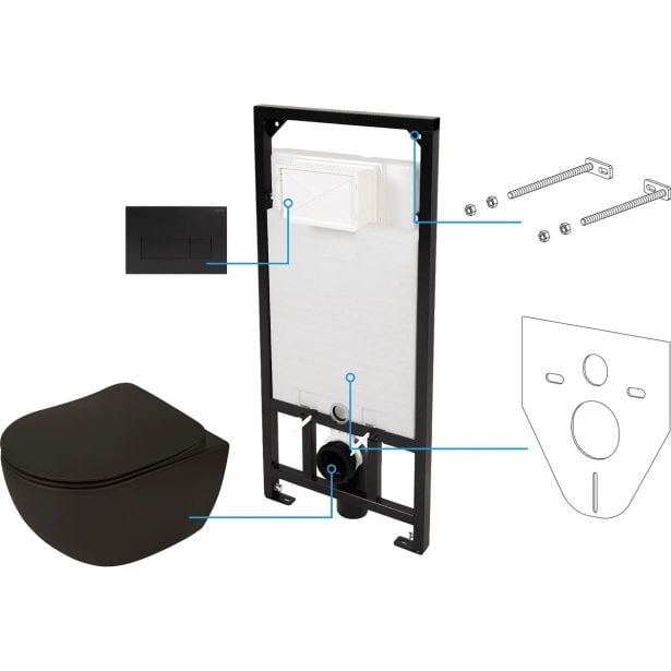 Toaletni komplet z visečo školjko je zasnovan za visoko estetiko prostora in enostavno čiščenje. Črna straniščna školjka, črna tipka.