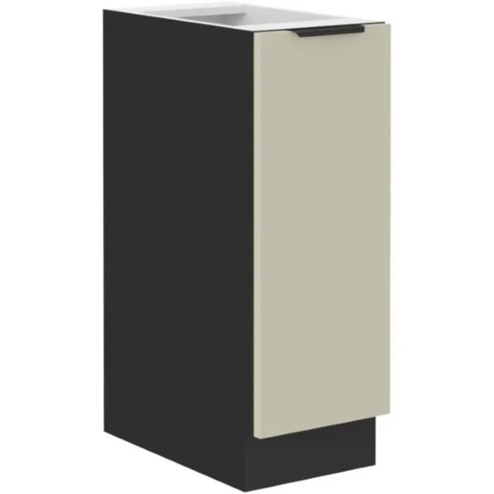 Spodnja izvlečna omara SINTIA 30D je narejena iz laminirane plošče, debeline 16 mm, robovi so iz ABS 1 mm, ročaj je iz aluminija v črni barvi. Korpus je narejen iz laminirane plošče, debeline 16 mm v črni barvi, robovi so iz melamina. Kuhinjski element je na voljo v kašmir barvi in ima mehko zapiranje.