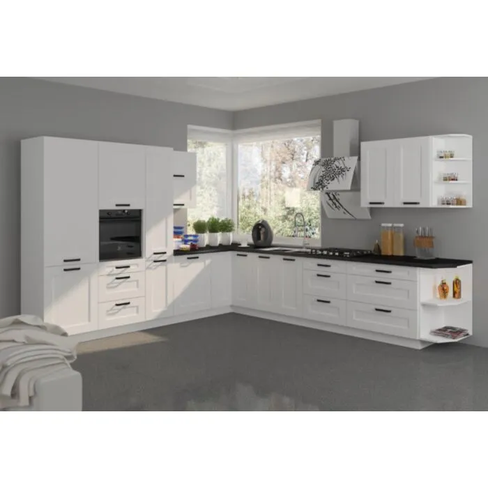 Spodnja kotna omara LIJA 105D je sestavljena iz MDF plošče, debeline 16 mm, robovi so iz ABS 1 mm, ročaji pa so iz kovine v črni barvi. Korpus je narejen iz laminirane plošče, debeline 16 mm, robovi so iz melamina. Kuhinjski element je na voljo v beli barvi in ima mehko zapiranje.