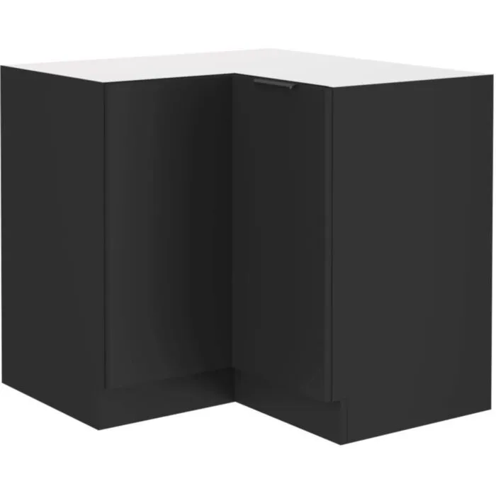 Spodnja kotna omara SAŠA 90 x 90D je sestavljena iz dveh front iz laminirane plošče, debeline 16 mm, robovi so iz ABS 1 mm, ročaja sta iz aluminija v črni barvi. Korpus je narejen iz laminirane plošče, debeline 16 mm, robovi so iz melamina. Kuhinjski element je na voljo v črni barvi in ima mehko zapiranje.