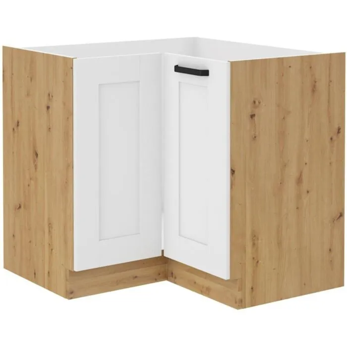 Spodnja kotna omara VANESA 90 x 90D je sestavljena iz MDF plošče, debeline 16 mm, robovi so iz ABS 1 mm, ročaji pa so iz kovine v črni barvi. Korpus je narejen iz laminirane plošče, debeline 16 mm, robovi so iz melamina. Kuhinjski element je na voljo v beli / hrast barvi in ima mehko zapiranje.