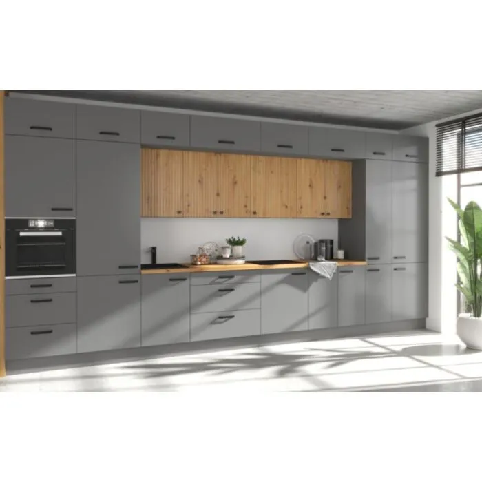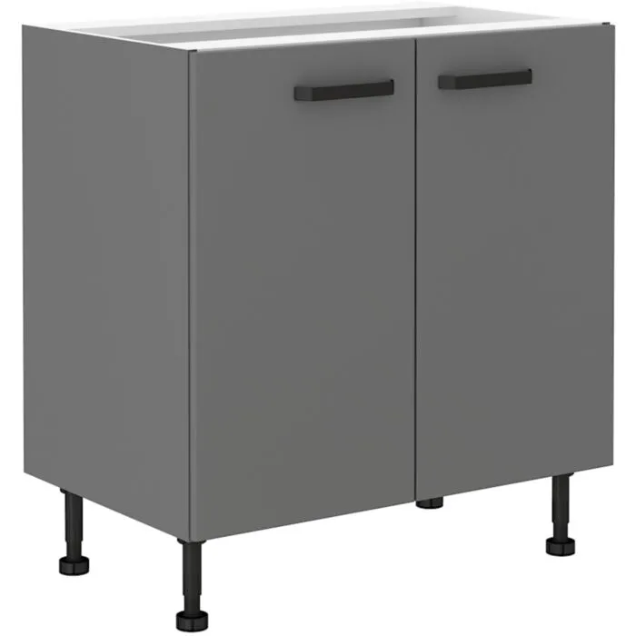 Spodnja omara NITA 80D je sestavljena iz MDF plošče, debeline 16 mm, robovi so iz ABS 1 mm. Korpus je narejen iz laminirane plošče, debeline 16 mm, robovi so iz melamina. Kuhinjski element je na voljo v barvi antracit in ima mehko zapiranje.