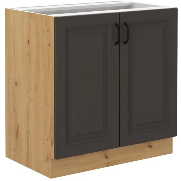 Spodnja omara PRESTIGE 80D je sestavljena iz dveh vrat iz MDF plošče, debeline 16 mm, robovi so iz ABS 1 mm, ročaja sta iz kovine v črni barvi. Korpus je narejen iz laminirane plošče, debeline 16 mm, robovi so iz melamina. Kuhinjski element je na voljo v barvi grafit / hrast in ima mehko zapiranje.