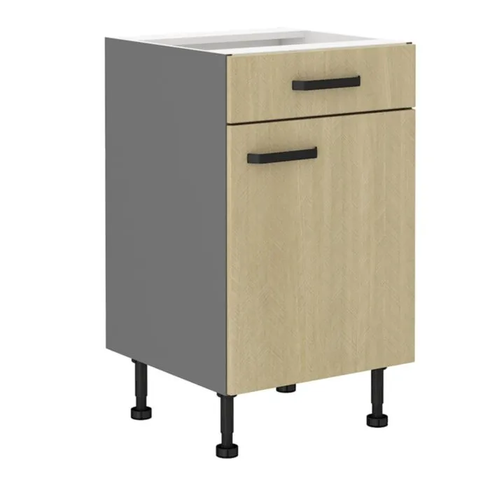 Spodnja omara RONA 50D 1P je sestavljena iz MDF plošče, debeline 16 mm, robovi so iz ABS 1 mm. Korpus je narejen iz laminirane plošče, debeline 16 mm, robovi so iz melamina. Kuhinjski element je na voljo v barvi antracita ter hrasta in ima mehko zapiranje.