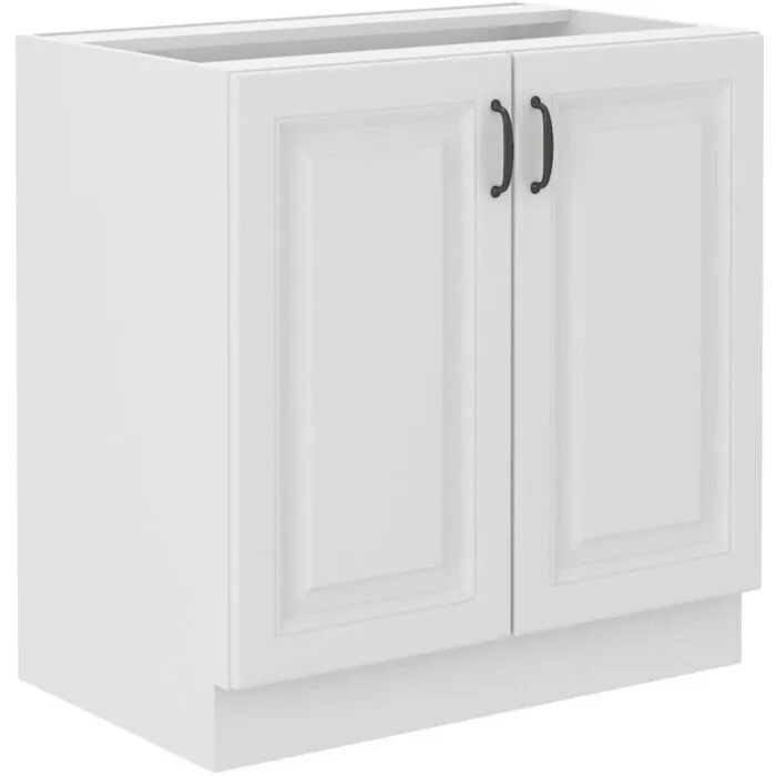 Spodnja omara SOFIA 80D je sestavljena iz dveh vrat iz MDF plošče, debeline 16 mm, robovi so iz ABS 1 mm, ročaja sta iz kovine v črni barvi. Korpus je narejen iz laminirane plošče, debeline 16 mm, robovi so iz melamina. Kuhinjski element je na voljo v beli barvi in ima mehko zapiranje.
