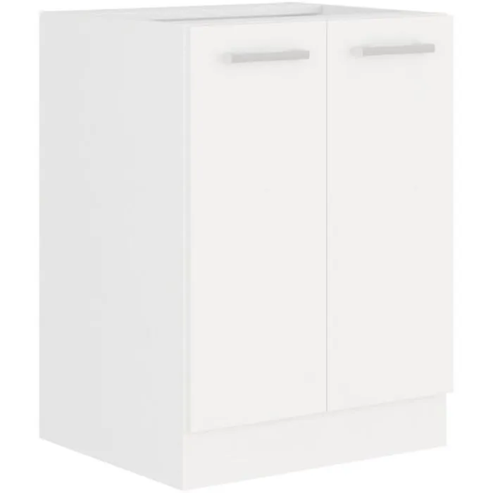 Spodnja omara STELLA 60D je sestavljena iz fronte iz MDF plošče, debeline 16 mm, robovi so iz ABS 1,7 mm. Korpus je narejen iz laminirane plošče, debeline 16 mm, robovi so iz melamina. Na voljo je v beli barvi korpusa in front ter sivi barvi ročajev. Kuhinjski elementi imajo sistem mehkega zapiranja.