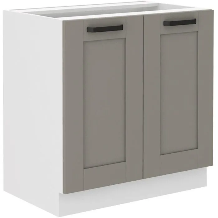 Spodnja omara TAJA 80D je sestavljena iz MDF plošče, debeline 16 mm, robovi so iz ABS 1 mm, ročaji pa so iz kovine v črni barvi. Korpus je narejen iz laminirane plošče, debeline 16 mm, robovi so iz melamina. Kuhinjski element je na voljo v barvi bela/taupe in ima mehko zapiranje.