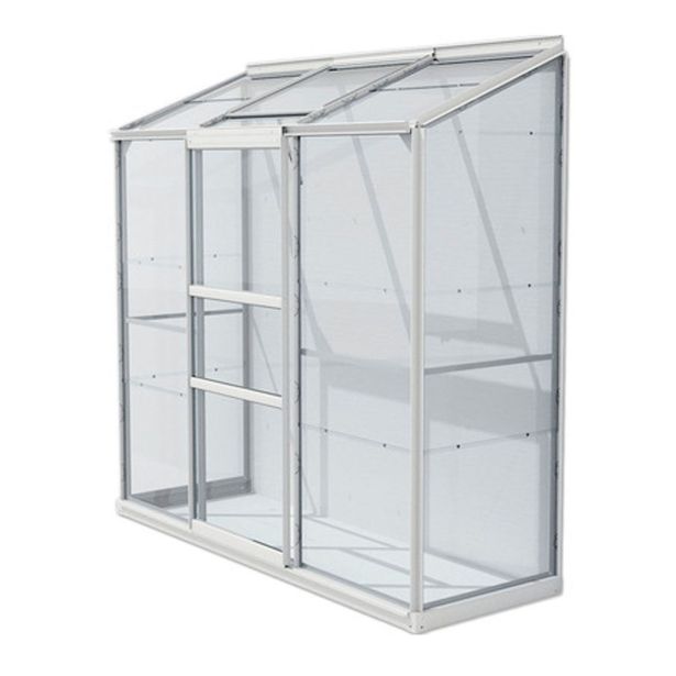Prislonjeni komplet za rastlinjak iz anodiziranih aluminijastih profilov in zasteklitve s približno 3 mm debelim, kristalno čistim varnostnim steklom (ESG). Artikla ni mogoče postaviti samostojno.