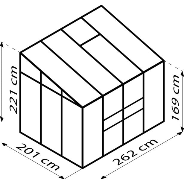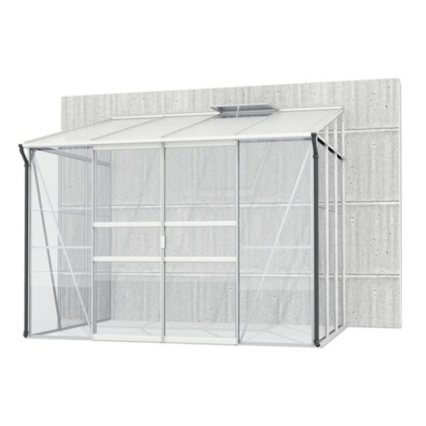 Komplet za prislonjen rastlinjak iz anodiziranih aluminijastih profilov in zasteklitve s kristalno čistim varnostnim steklom na straneh in UV-stabiliziranimi votlimi komornimi ploščami (PC) v strehi. Artikla ni mogoče postaviti samostojno.