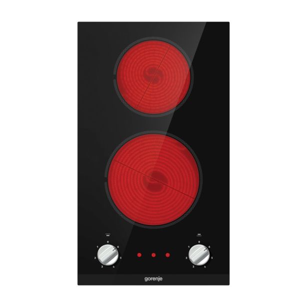 Steklokeramična plošča z dvema kuhališčima. Fasetiran sprednji rob kuhališča. Pokazatelj preostale toplote. Upravljanje z gumbi.
