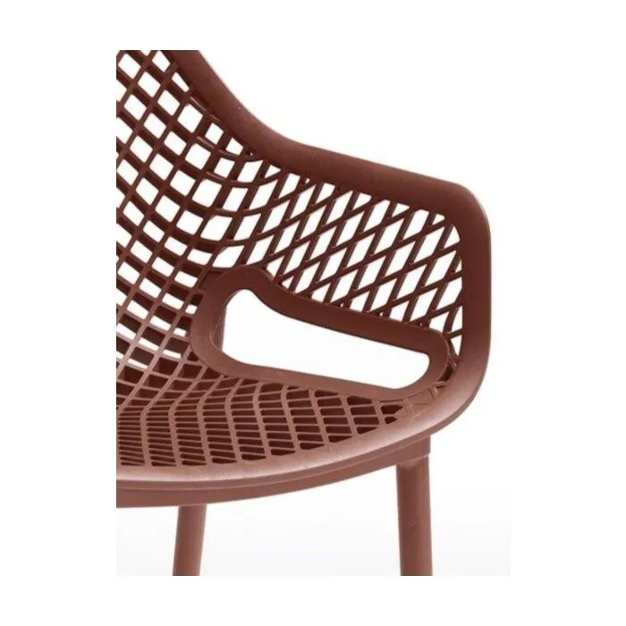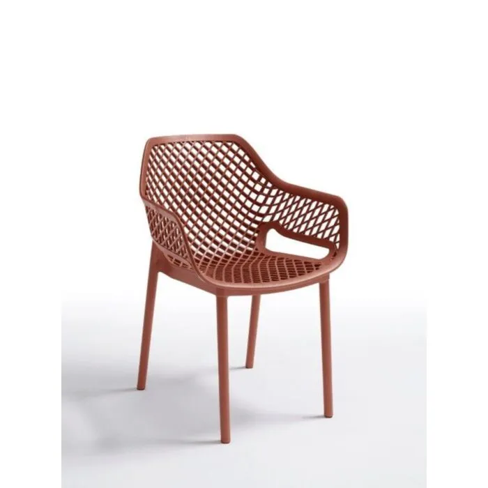 Stol RIO v opečnato rdeči barvi, je moderen stol izdelan iz polipropilena, kateremu so dodana steklena vlakna za še večjo trdnost. Stol je namenjen tako za zunanjo uporabo kot vrtni stol ali pa bo našel mesto v vaši jedilnici. Stol je idealen tudi za terase in gostinske obrate. Stol Rio ima tudi UV zaščito, kar stolu omogoča, da več časa ohranja prvotno barvo na soncu. Stoli so nakladalni, zato pri spravilu vzamejo malo prostora.