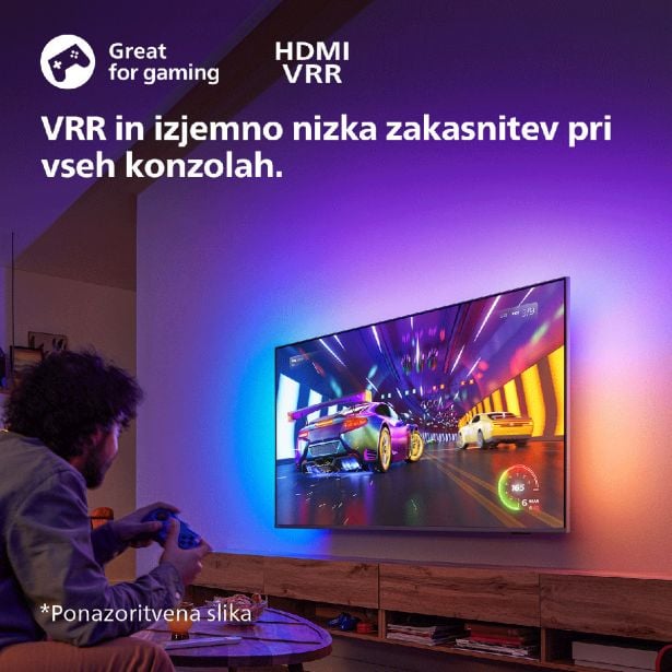 HDMI 2.1 omogoča optimalen izkoristek igralne konzole, popolnoma odzivno igranje in povsem gladko grafiko. Podpora VRR ob vklopu igralne konzole samodejno omogoči način nizke zakasnitve. Z izbranim slogom Ambilight bo vznemirjenje ob igranju videoiger še večje.