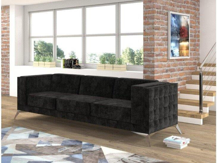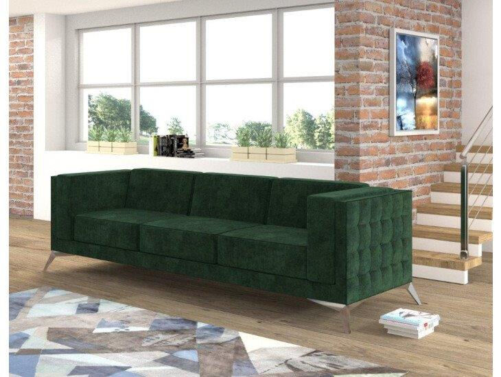 Trosed DALAS je elegantnega videza kateri bo polepšal vsak prostor. Vzmeten je z valovitimi vzmetmi. Narejen je iz visoko elastične poliuretanske pene. Okvir je iz masivnega lesa, iverne plošče, HDF in MDF. Nogice so metalne v krom barvi.