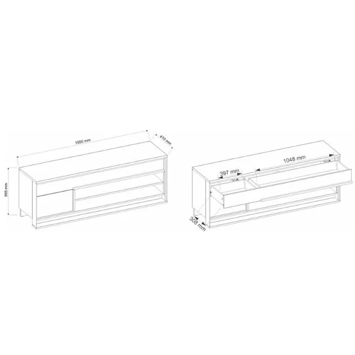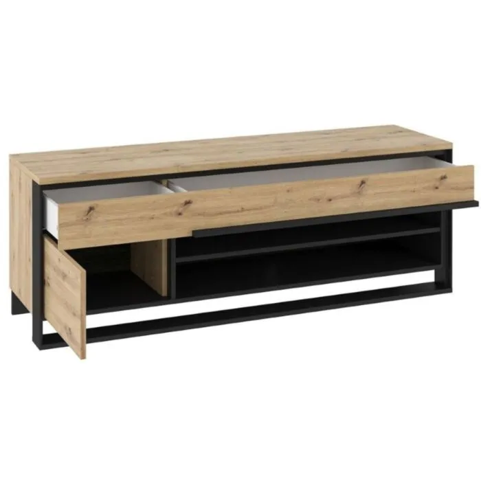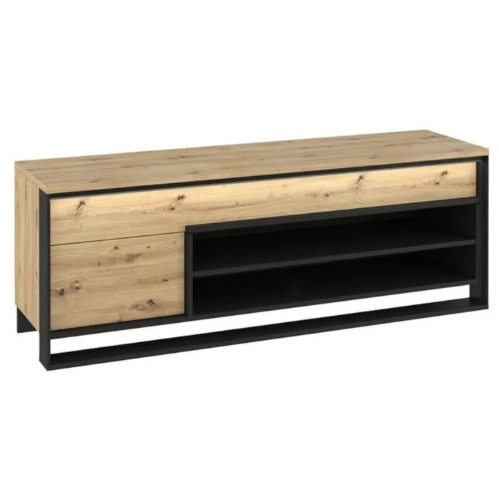Široka TV omara KVIN v sodobnem izgledu in modernom dizajnom. Priporočna je za shranjevanje vseh nepotrebnih stvari ki se nabirajo v dnevni sobi. Ima 2 vdolbini, prostim predalom in omarico z vrati. Ima zanimiv dekor in črno, vitko podporo. Ima LED osvetlitev. Udobno uporabo podpira mehanizem PUSH TO OPEN.