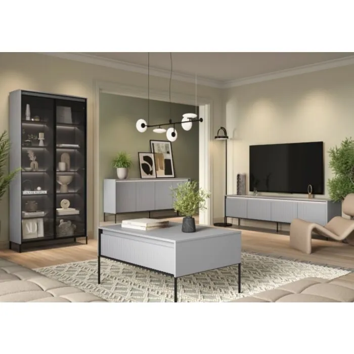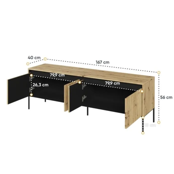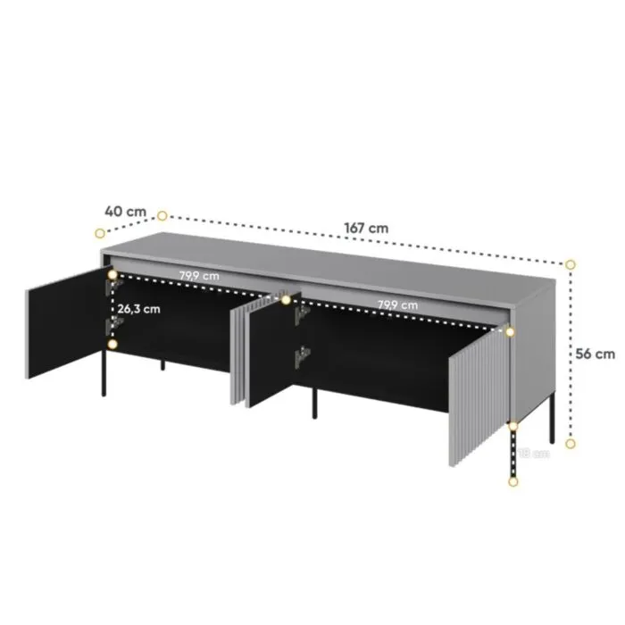 TV omarica TERA, v sodobnem izgledu in modernem dizajnu je odlična za shranjevanje vseh nepotrebnih stvari, ki se nabirajo v dnevni sobi. Ima LED osvetlitev, ki dodatno popestri vaš prostor. Narejena je iz kakovostne laminirane plošče debeline 12 mm. Zaradi svoje oblike in visokokakovostnih materialov je trpežna in vzdržljiva. Odporna je na praske, udarce in obrabo. Je enostavna za vzdrževanje, saj je površina preprosta za čiščenje in negovanje. Estetsko se poda v vsak prostor ter ima dobro odpornost na madeže in vlago.