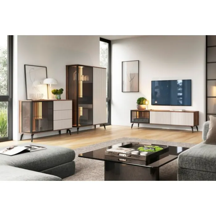 Estetsko se poda v vsak prostor ter ima dobro odpornost na madeže in vlago. Ima ABS robove, ki zagotavljajo večjo odpornost proti udarcem, vlagi in obrabi ter podaljšujejo njeno življenjsko dobo. ABS robovi ne le ščitijo pred poškodbami, ampak poskrbijo tudi za lepši in elegantnejši videz pohištva. Za dodatno eleganco in prefinjenost ima TV omarica LED osvetlitev ter sistem “PUSH TO OPEN” za enostavno odpiranje in zapiranje, brez nepotrebnih ročajev.