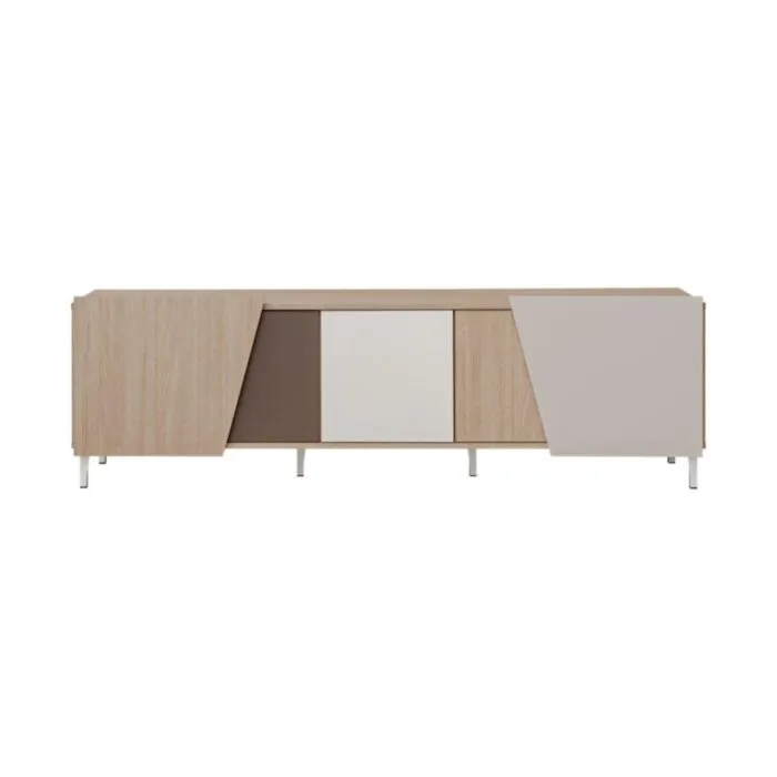 TV omarica VIZIJA je moderno oblikovana in elegantnega videza, brez ročajev. V kombinaciji barv, bele, bež in rjave z lesenim delom. Izdelana v EU iz laminirane plošče debeline 16mm in ABS robovi. Nogice ima matalne, bele barve.