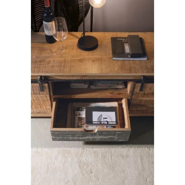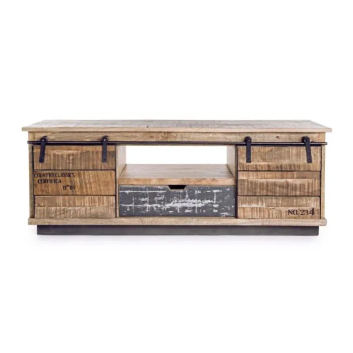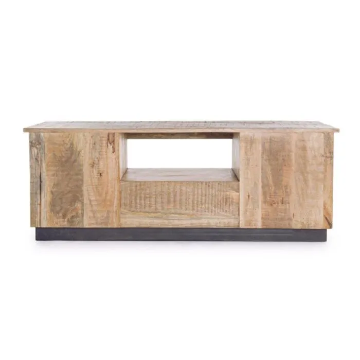 Tv regal TUDOR je narejen iz lesenega okvirja (mango), podnožje je kovinsko.