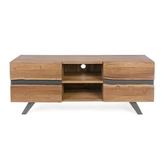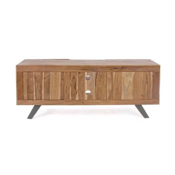 TV regal 2A ARON ima okvir iz lesa in jeklene noge, vrata imajo kovinski vložek.