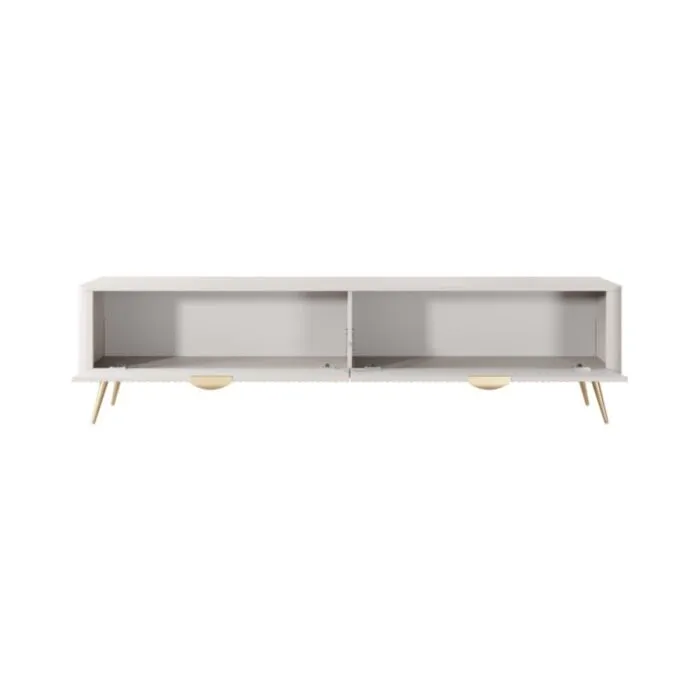 TV regal LILJA – 163, je eleganten kos pohištva, ki popestri vaš prostor s svojim luksuznim dizajnom. Narejen je iz kakovostnih materialov v barvi beige. Izdelan je iz MDF-ja in ABS robov. Ima kovinske ročaje in nogice v zlati barvi.