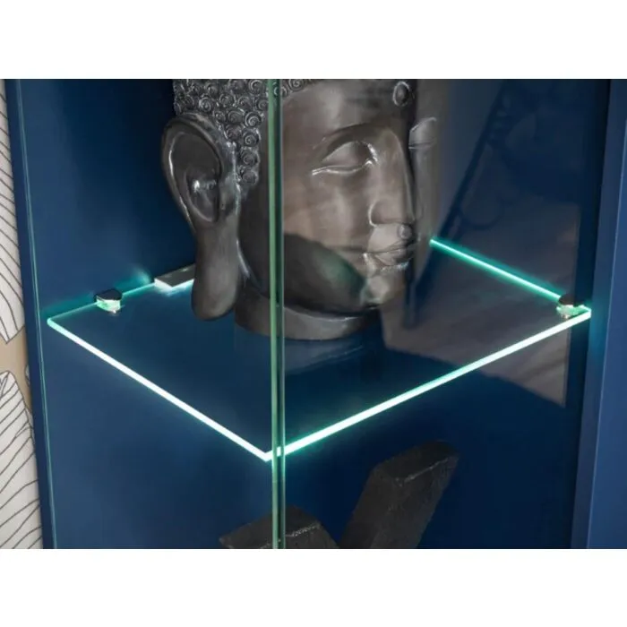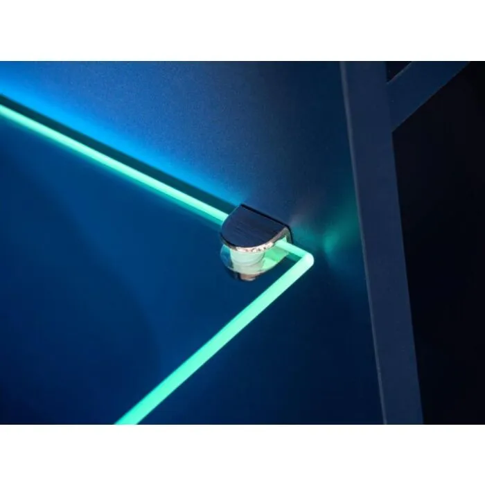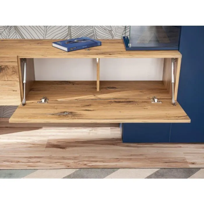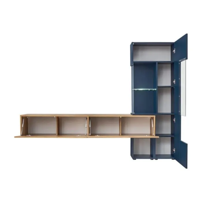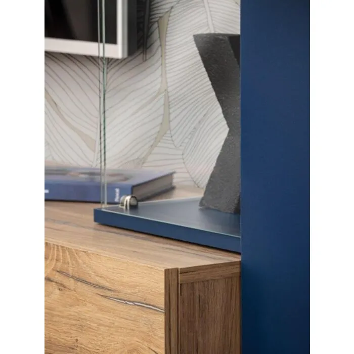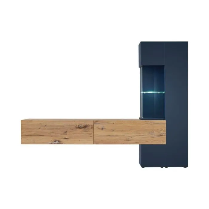TV regal MORNAR je narejen iz kvalitetne laminirane plošče s PVC frontami. Zastekljeni del je narejen iz kaljenega stekla in odpira se brez ročajev. Vsebuje LED osvetlitev. Spodnja omarica, ki je sestavljena iz dveh omaric se odpira navzdol.