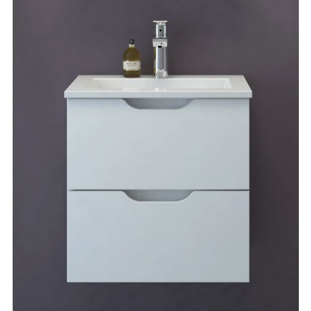 Umivalniška enota AQUAESTIL JANA 50 v beli barvi z dvema predaloma mehkega zapiranja in umivalnikom iz litega marmorja.