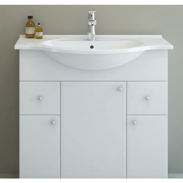 Umivalniška enota AQUAESTIL LIDIJA 80 v beli barvi s keramičnim umivalnikom, tremi vrati in dvema predaloma.
