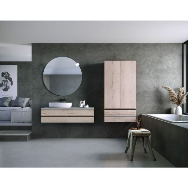 Kopalniška elegantna linija Alexis je vrhunski slovenski dizajn. Kolpa San OA 100 CW v barvi naravnega lesa, je izjemno praktična in estetska omara. Ohišje je oblikovano iz trpežnih laminiranih plošč (LTD) iz rafinirane iverne plošče, medtem ko je sprednji del predalov izdelan iz plošče (MDF), prekrite s 3D folijo v enaki barvi kot telo, kar ustvarja harmoničen videz. ter edinstven material Kerrock zagotavljajo trajnost in enostavno vzdrževanje.