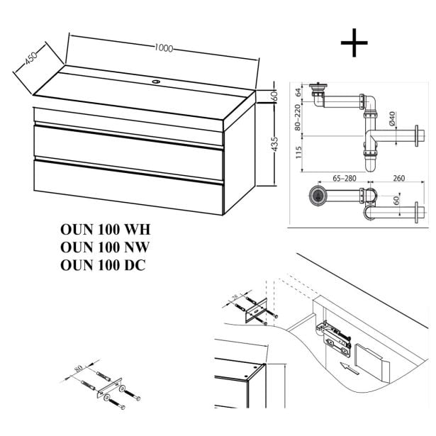 – Dimenzija ( Š x V x G): 1000 x 435 + 60 umivalnik x 450 mm.