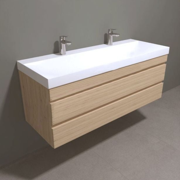 Kopalniška omarica ima zgornji del dopolnjen z belim dvojnim umivalnikom iz litega marmorja, na katerega je pritrjen sifon, vendar grez pokrova ali odtolnega čepa. Umivalnik ima dve luknji za kopalničko armaturo.
