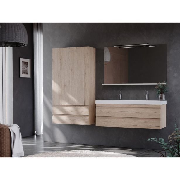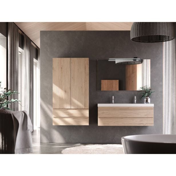 Kopalniška omarica z umivalnikom Kolpa san OUN 120 NW iz linije Naomi je izdelana v barvi naravnega lesa. Kopalniška omarica se montira na steno. Dimenzija visoke kopalniške omarice ( Š x V x G) 1200 x 435+60 x 450 mm. Umivalnik ima dve luknji za kopalniški pipi.
