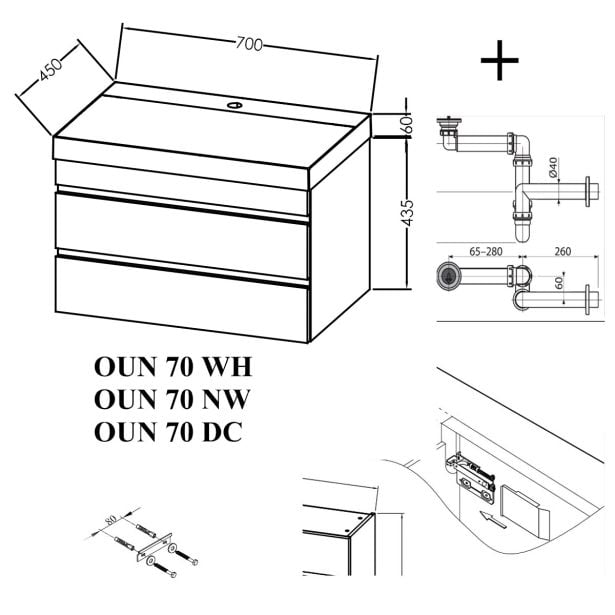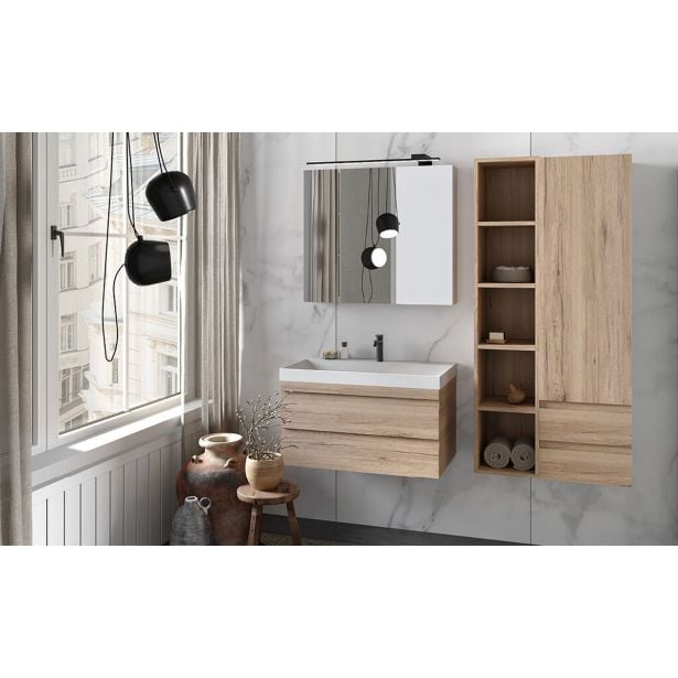 Kopalniška omarica z umivalnikom Kolpa san OUN 70 NW iz linije Naomi je izdelana v barvi naravnega lesa. Kopalniška omarica se montira na steno. Dimenzija visoke kopalniške omarice ( Š x V x G) 700 x 435+60 x 450 mm.
