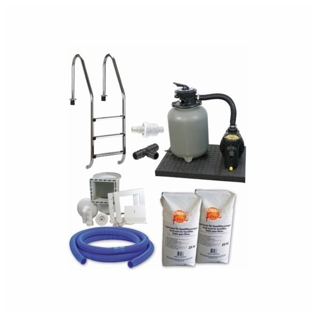 Montažni vgradni bazen, ovalne oblike, mere 320x600x120 cm, jeklen plašč 0,6 mm, folija 0,6 mm-modra primeren samo za vgradnjo, folija 0,6 mm-modra, peščeni filter, vgradna lestev iz nerjavnega jekla.