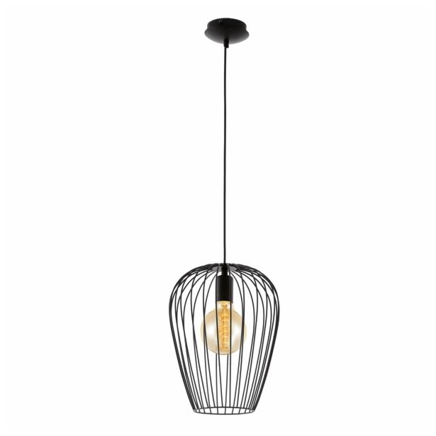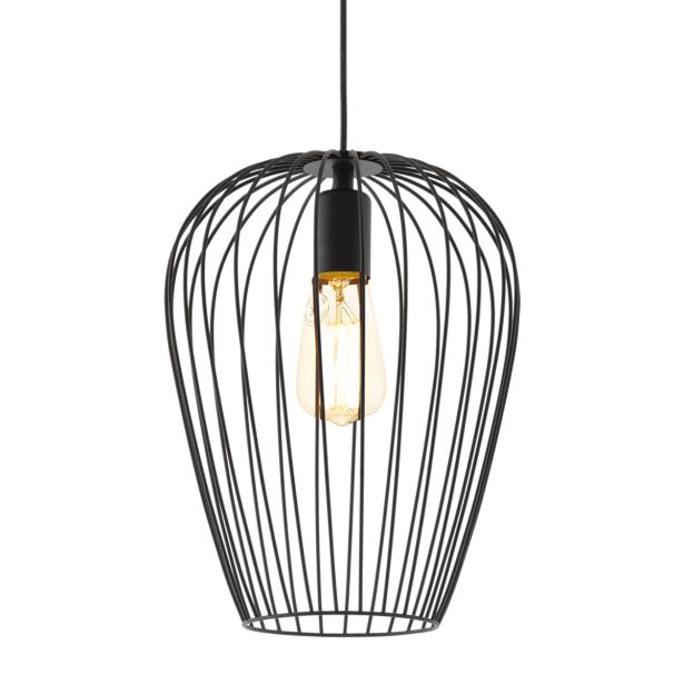 Viseča svetilka NEWTOWN ima ovalni senčnik iz črne žice, ki visi na okroglem črnem kovinskem nadstrešku.