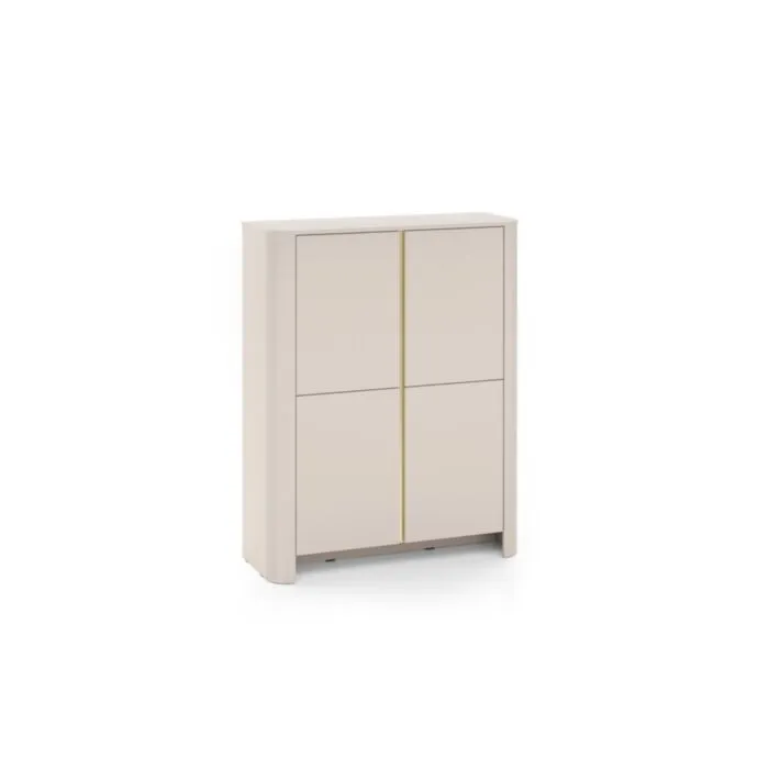 Visoka komoda BARBA kašmir je elegantna in preprosta. S svojo obliko in kakovostjo se poda v vsak dnevni prostor. Narejena je it kakovostnega MDF-ja. Ima nogice posebne oblike, zato zagotavljajo še dodatno stabilnost. Zaradi svoje oblike in visokokakovostnih materialov je trpežna in vzdržljiva. Odporna je na praske, udarce in obrabo. Je enostavna za vzdrževanje, saj je površina preprosta za čiščenje in negovanje.
