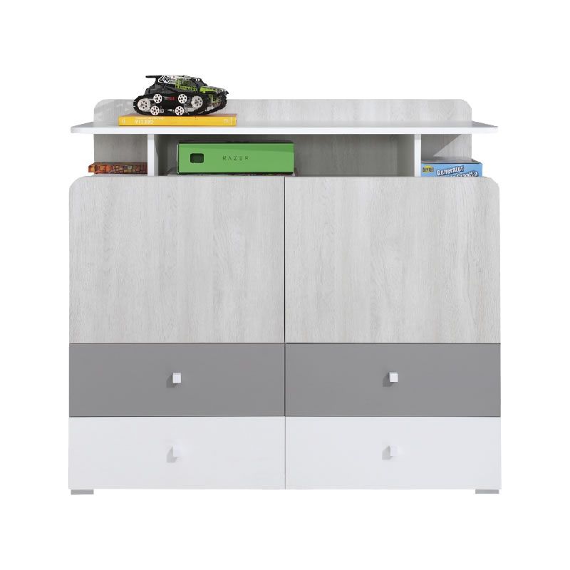 Prostorna komoda iz kolekcije Como je evropske izdelave. Komoda nudi veliko prostora za shranjevanje. Sestavljajo jo štirje predali in dvoje vrat. Nežne nevtralne barve serije so primerne tako za fante kot za dekleta. Pohištvo Como se lahko uporabi tudi kot pisarna ali le posamezni elementi.