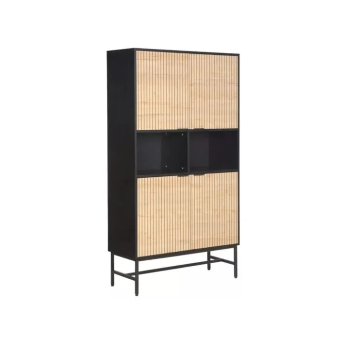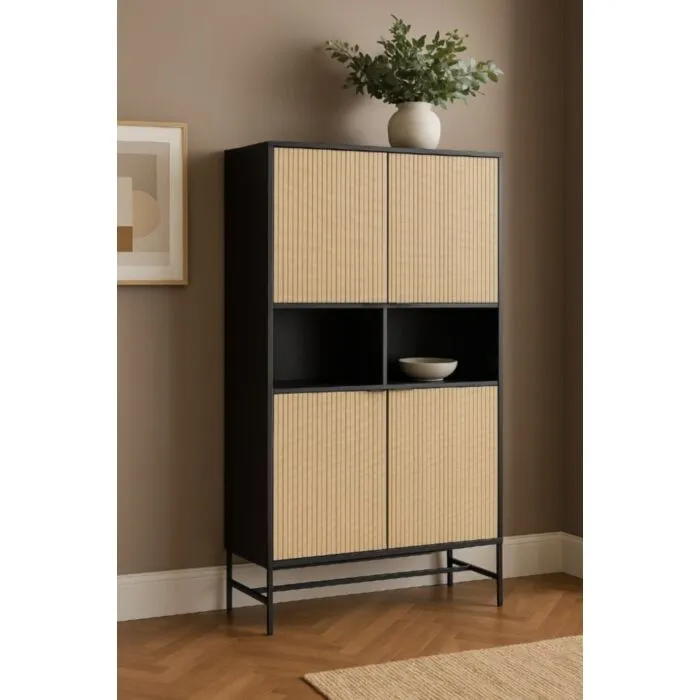 Visoka komoda SINI je moderen in eleganten kos pohištva. Odlično se poda v vsak prostor, zaradi svojega edinstvenega dizajna. Je v črni barvi s kombinacijo hrast barve. Narejena je iz visokokakovostne laminirane plošče. Zaradi svoje oblike in visokokakovostnih materialov je trpežna in vzdržljiva. Odporna je na praske, udarce in obrabo. Je enostavna za vzdrževanje, saj je površina preprosta za čiščenje in negovanje. Estetsko se poda v vsak prostor ter ima dobro odpornost na madeže in vlago.