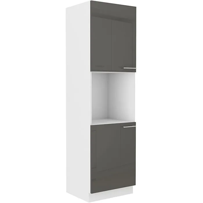 Visoka omara ELZA 60D 2 je sestavljena iz fronte iz MDF plošče, debeline 16 mm, robovi so iz ABS 1 mm. Korpus je narejen iz laminirane plošče, debeline 16 mm, robovi so iz melamina. Kuhinjski element je na voljo v capuccino barvi visoki sijaj, beli barvi visoki sijaj in sivi barvi visoki sijaj. V komentarju dopišete, katero barvno kombinacijo želite. Kuhinjski elementi imajo sistem mehkega zapiranja.