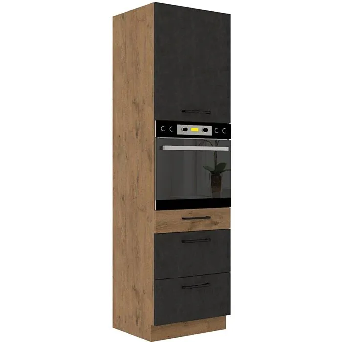 Visoka omara PARIZ 60D 5 je sestavljena iz fronte iz MDF plošče, debeline 16 mm, robovi so iz ABS 1 mm, ročaji so iz plastike v sivi barvi. Korpus je narejen iz laminirane plošče, debeline 16 mm, robovi so iz melamina. Kuhinjski element je na voljo v barvi hrasta z matero in ima mehko zapiranje.